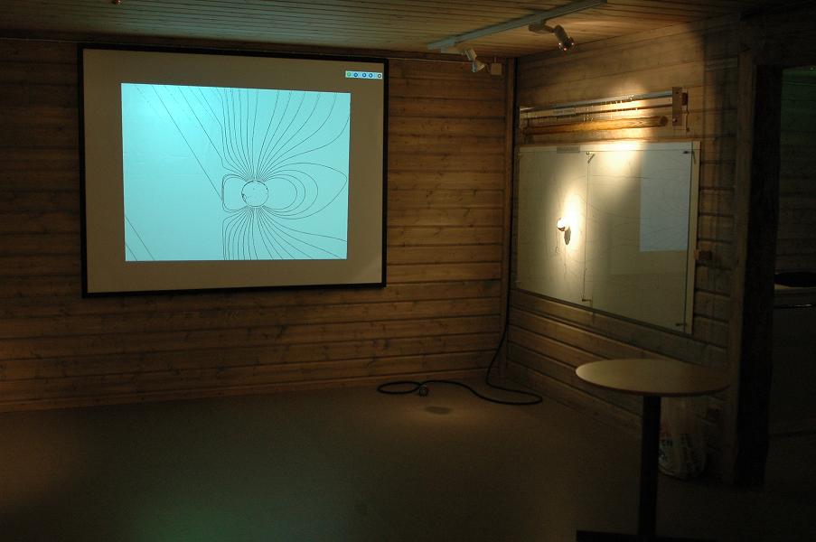 Till vänster finns jordens magnetfält som är stört av solvinden.Till höger finns jordens magnetosfär modellerad på en glasskiva med löstagbar jord, som har en magnet i centrum. Med hjälp av den magnetiska proben, hängande mitt på glasskivan, kan man få en uppfattning om jordens magnetfält nära dess yta!